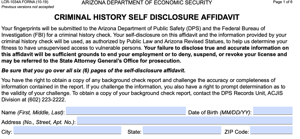Self-disclosure on this affidavit and the information provided by the signer’s criminal history check, as authorized by Public Law and Arizona Revised Statutes, will be used to help determine the signer’s fitness for unsupervised access to vulnerable persons.