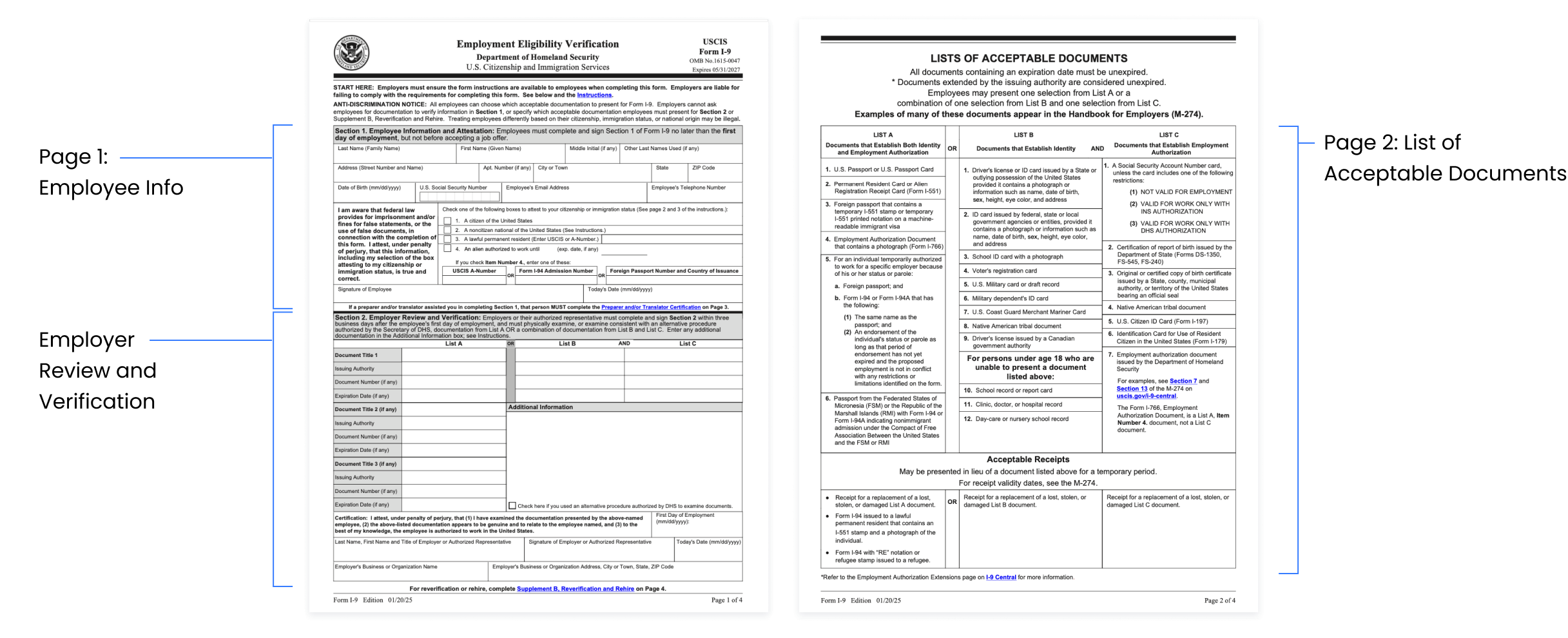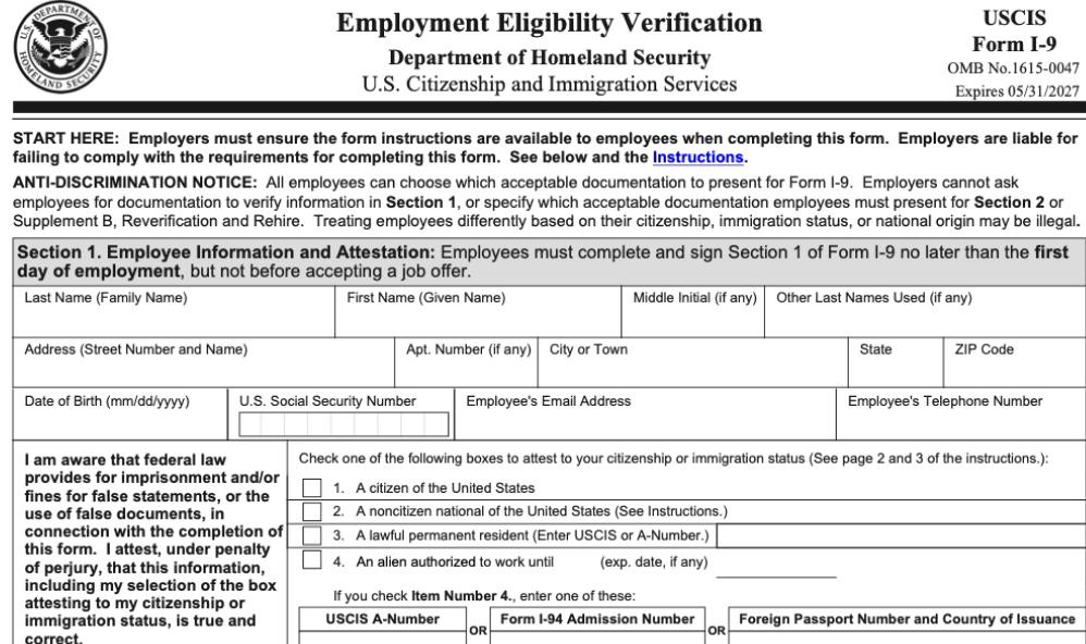 The I-9 Form helps the government ensure only eligible workers are employed in the U.S. Every new hire must complete this form.