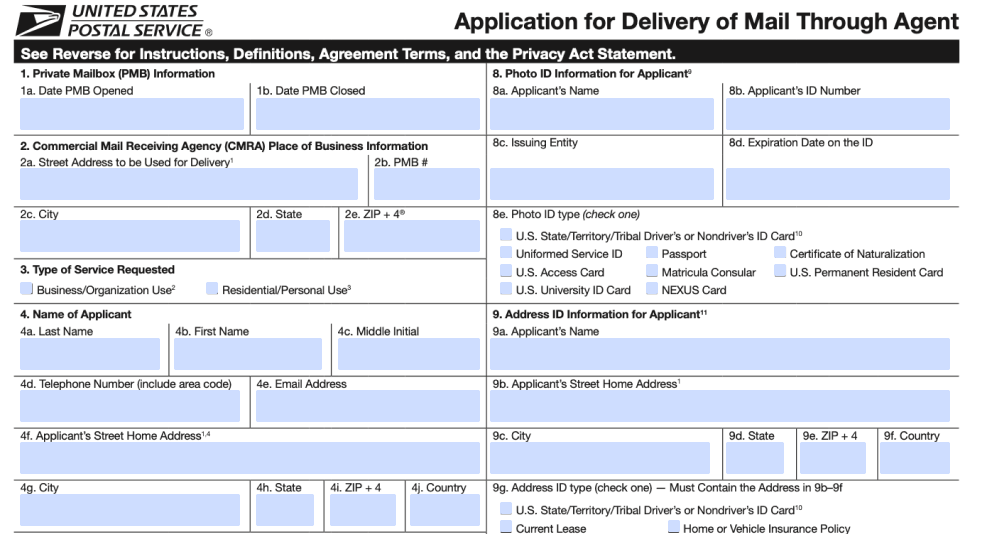 This form, known officially as the Application for Delivery of Mail Through Agent, allows another person or company to collect your mail.