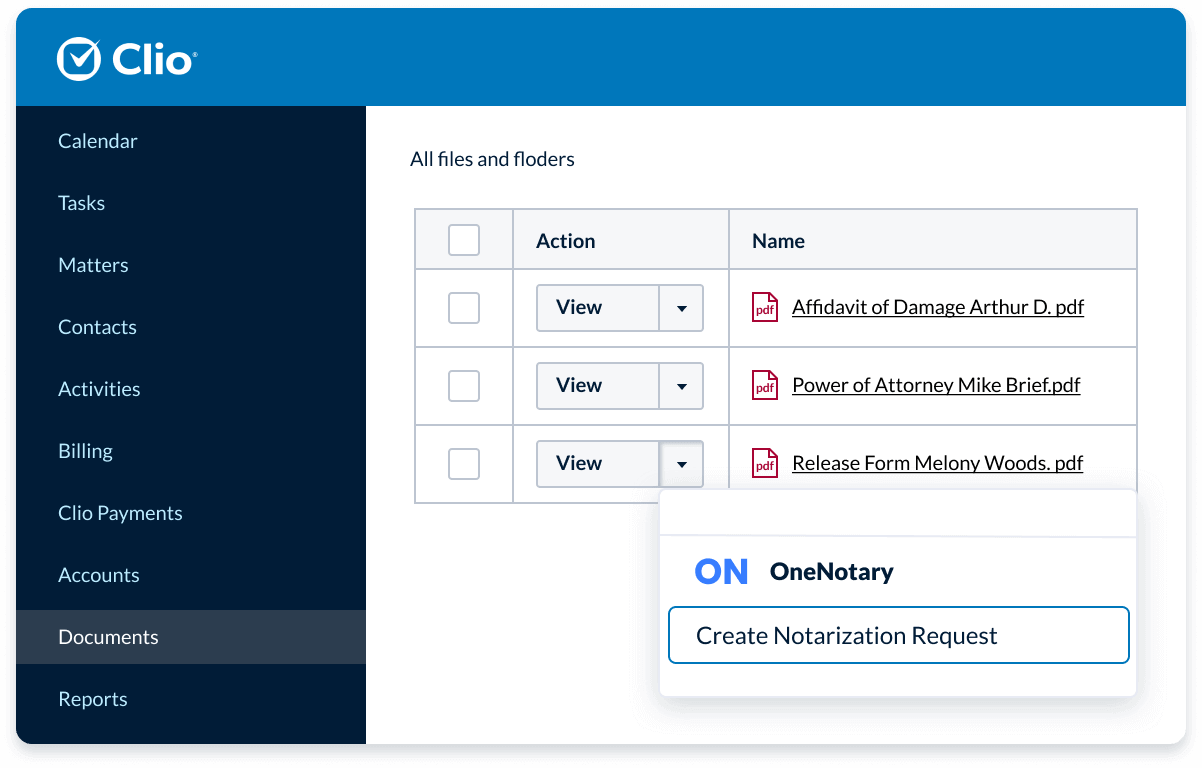 Choose any client document in Clio that needs notarization — affidavits, trusts, and more.